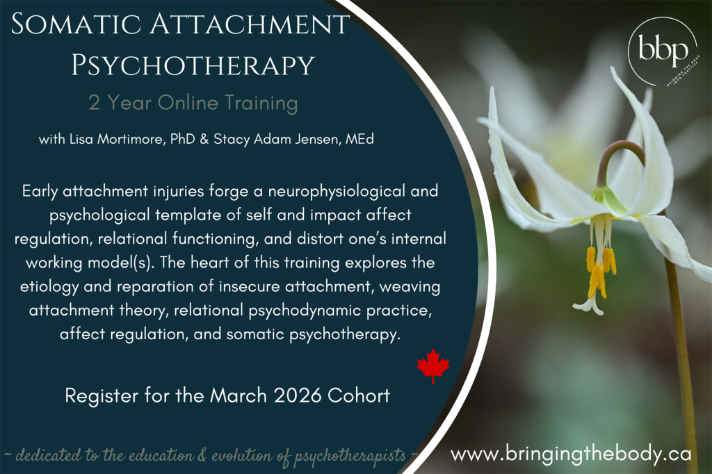 Early relational experiences forge a neurophysiological and psychological template of self, often creating insecure attachment which distorts the development of self, and impacts relational functioning throughout the lifespan. Corresponding affect management strategies and attachment patterns, accompanied by dysregulation of the Autonomic Nervous System (ANS), impact one’s self perceptions, world, and identity. This legacy of trauma deeply impacts the integrity of the self, creating a split between psyche, body, and spirit. Therapists are called to facilitate shifting of affect management strategies, attachment patterning, and support the maturation and development of complex right brain functioning to heal relational trauma, including insecure attachment, PTSD, and chronic shame, rather than merely working with symptom reduction. This SAP training responds to this call and offers an immersive educational experience to deepen embodiment and capacity as therapist.